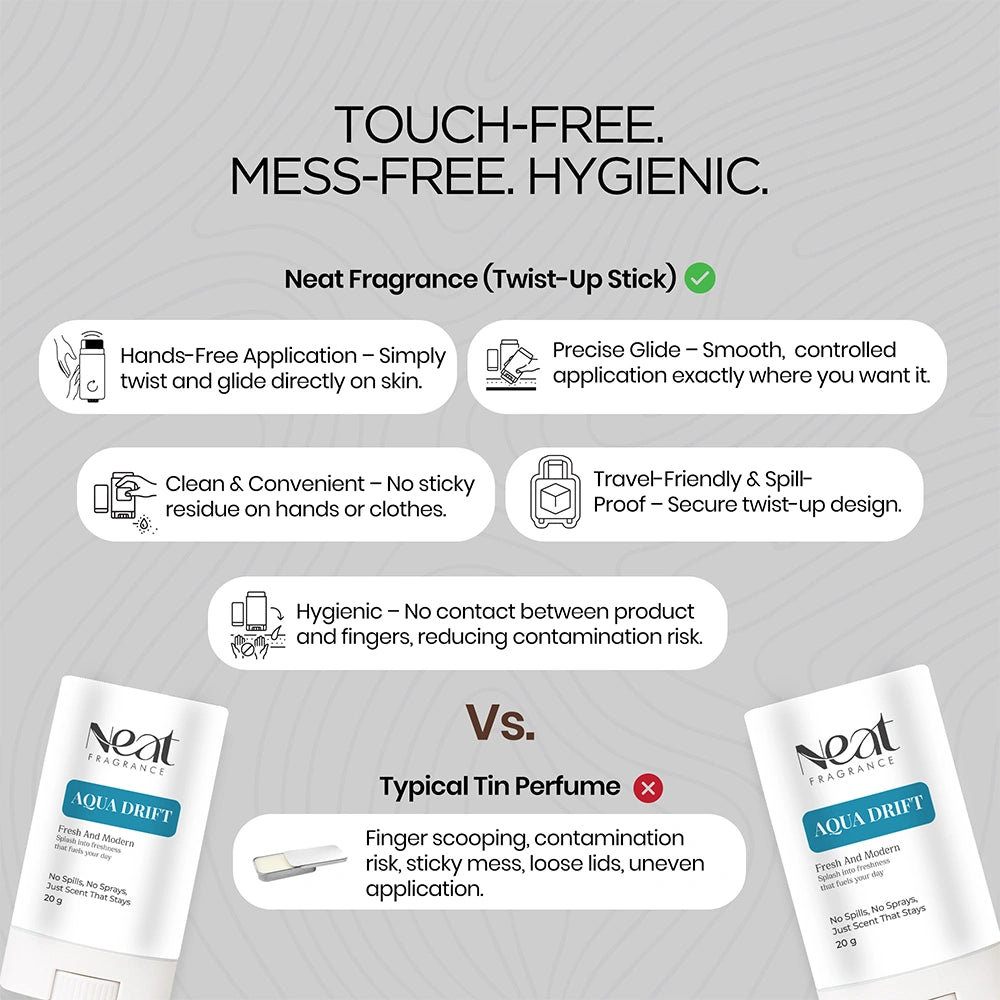 Aqua Drift is your crisp, go-anywhere scent — modern, aquatic, and uplifting. It’s light enough for everyday wear, with salty neroli and driftwood leaving a cool impression.