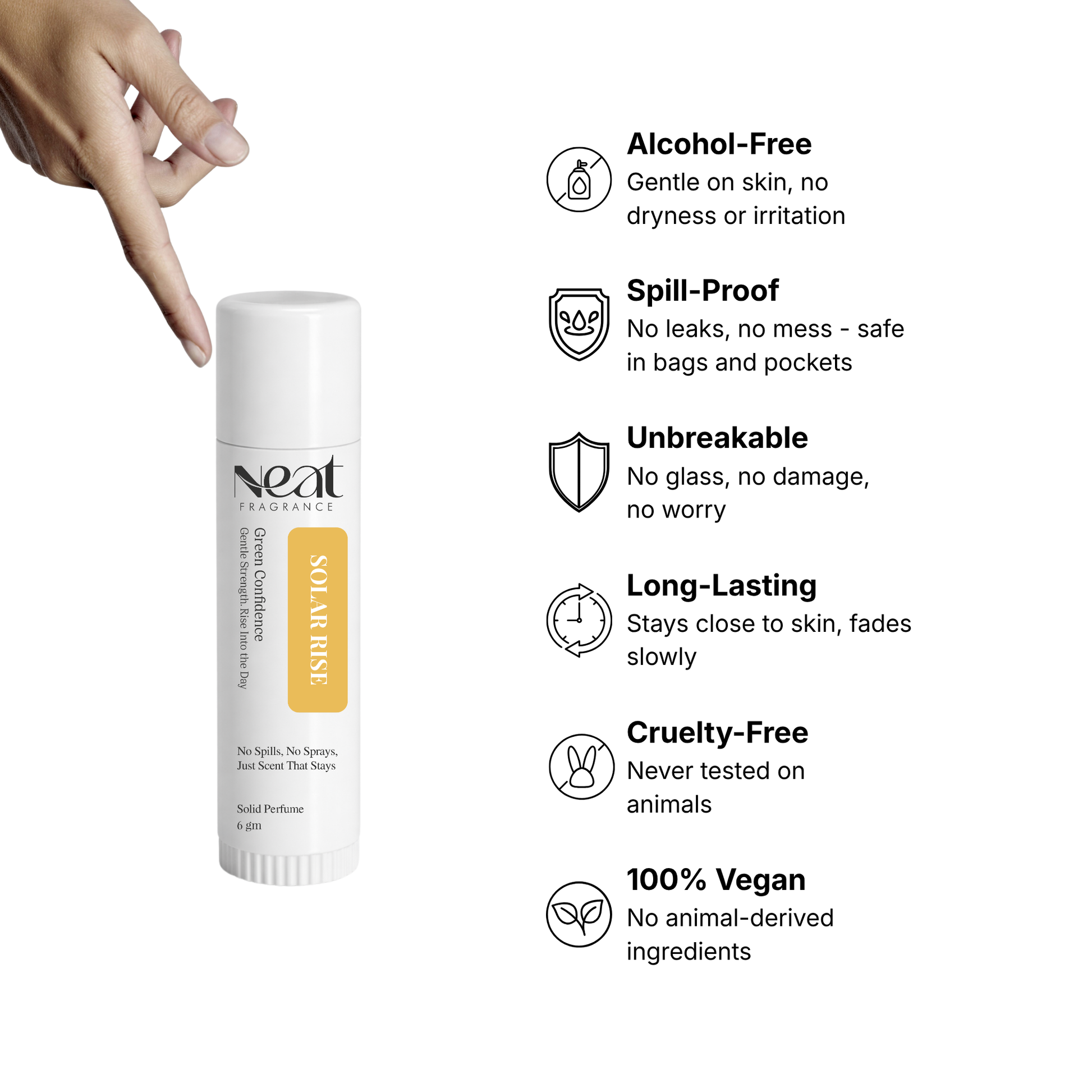 • Solid perfumes are highly concentrated and oil-based. Apply only on skin—avoid direct application on clothes, as it may leave marks