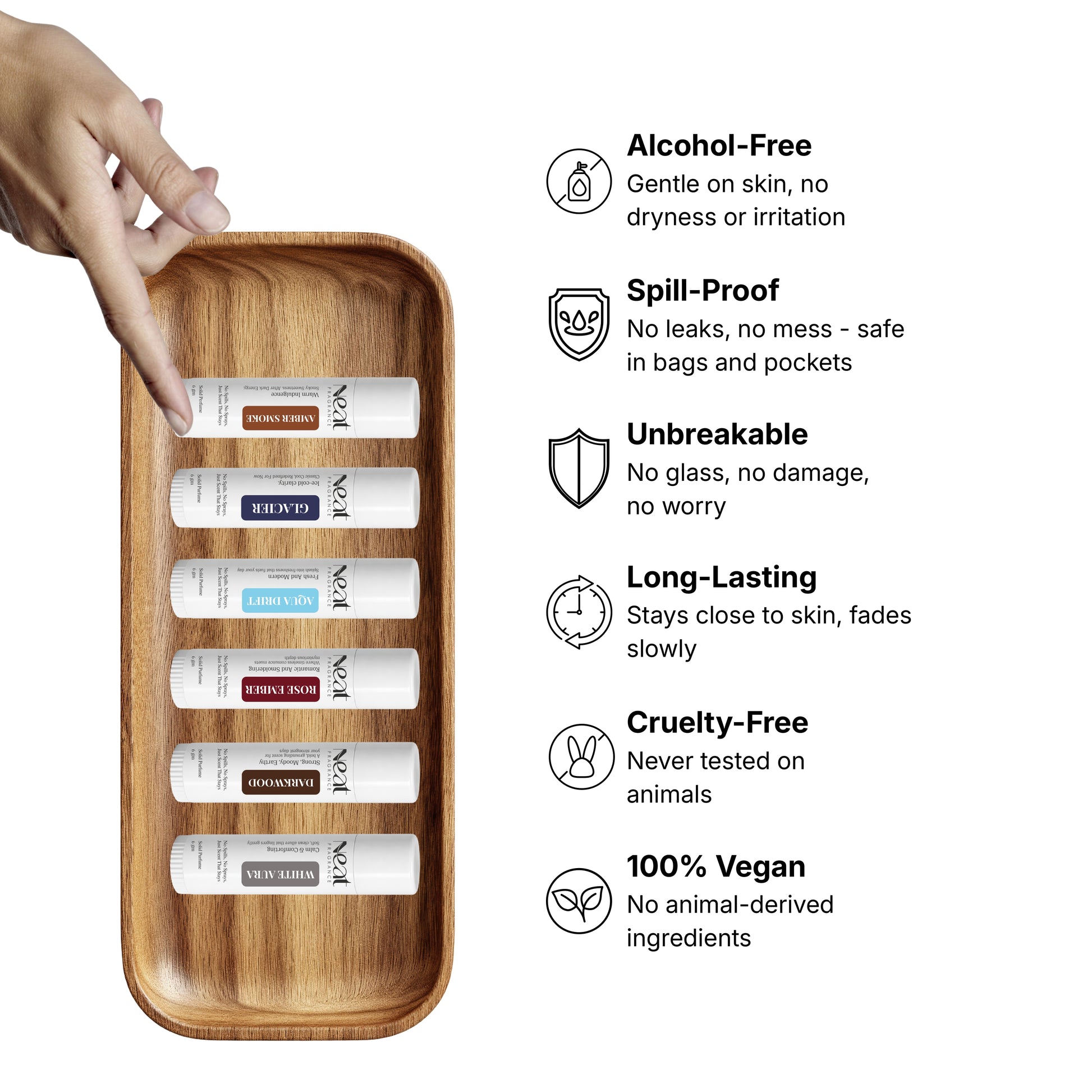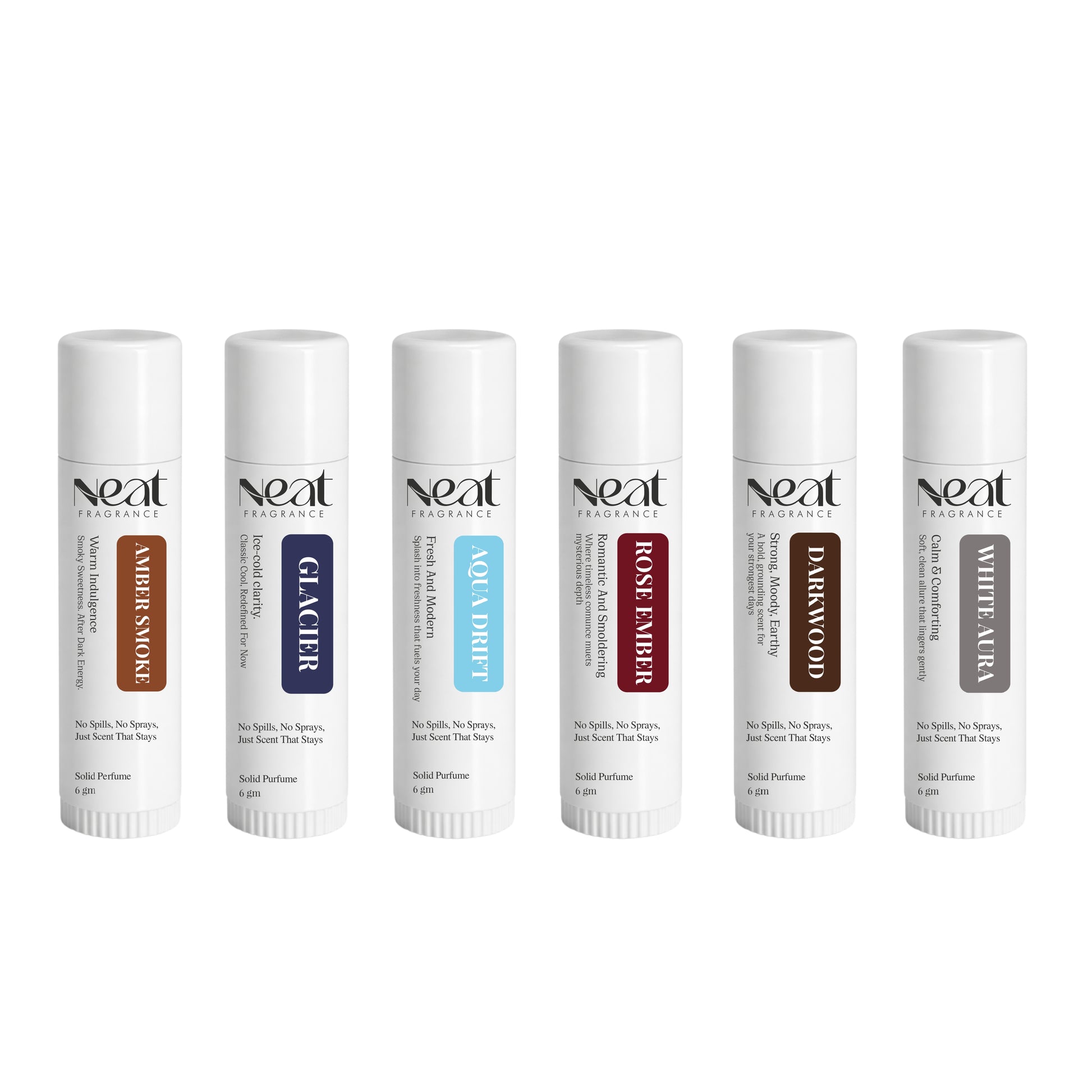 The Neat Fragrance Complete Collection is a curated set of six distinct solid perfumes, each crafted to match a different mood, moment, and identity. From the soft intimacy of White Aura to the bold depth of Amber Smoke, from the freshness of Aqua Drift to the elegance of Rose Ember - this bundle is built for versatility.